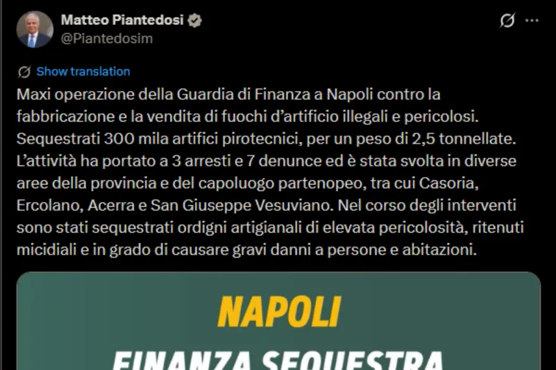 Il ministro dell’Interno Matteo Piantedosi ha scritto su X: «maxi operazione della Guardia di Finanza a Napoli contro la fabbricazione e la vendita di fuochi d’artificio illegali e pericolosi. Sequestrati 300 mila artifici pirotecnici, per un peso di 2,5 tonnellate. L’attività ha portato a 3 arresti e 7 denunce ed è stata svolta in diverse aree della provincia e del capoluogo partenopeo, tra cui Casoria, Ercolano, Acerra e San Giuseppe Vesuviano. Nel corso degli interventi sono stati sequestrati ordigni artigianali di elevata pericolosità, ritenuti micidiali e in grado di causare gravi danni a persone e abitazioni».