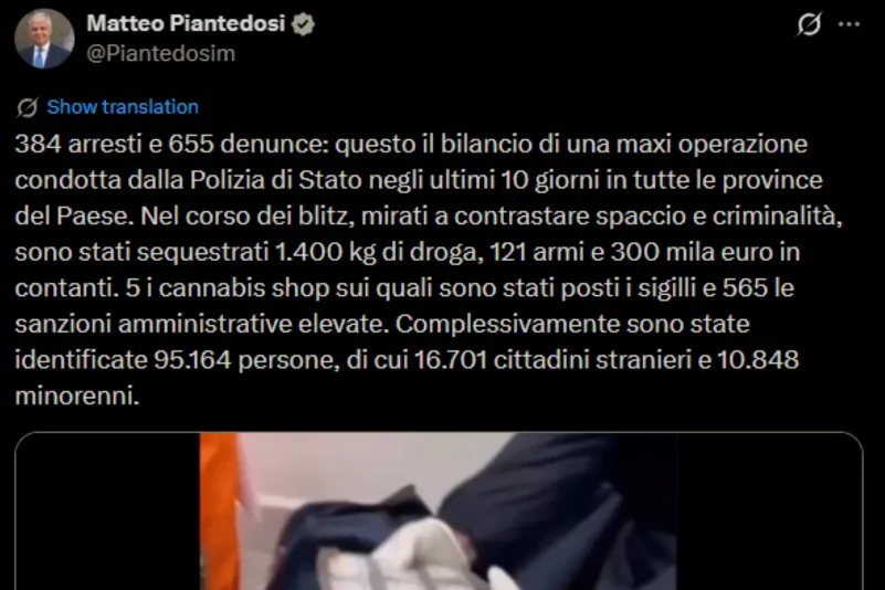 Il ministro dell’Interno Matteo Piantedosi ha scritto su X: «384 arresti e 655 denunce: questo il bilancio di una maxi operazione condotta dalla Polizia di Stato negli ultimi 10 giorni in tutte le province del Paese. Nel corso dei blitz, mirati a contrastare spaccio e criminalità, sono stati sequestrati 1.400 kg di droga, 121 armi e 300 mila euro in contanti. 5 i cannabis shop sui quali sono stati posti i sigilli e 565 le sanzioni amministrative elevate. Complessivamente sono state identificate 95.164 persone, di cui 16.701 cittadini stranieri e 10.848 minorenni».