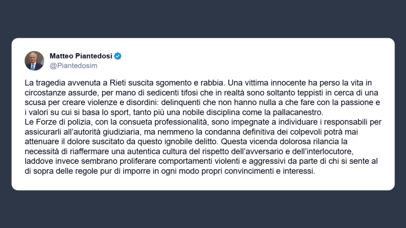 Il ministro dell’Interno, Matteo Piantedosi, ha annunciato su X: «La tragedia avvenuta a Rieti suscita sgomento e rabbia. Una vittima innocente ha perso la vita in circostanze assurde, per mano di sedicenti tifosi che in realtà sono soltanto teppisti in cerca di una scusa per creare violenze e disordini: delinquenti che non hanno nulla a che fare con la passione e i valori su cui si basa lo sport, tanto più una nobile disciplina come la pallacanestro».