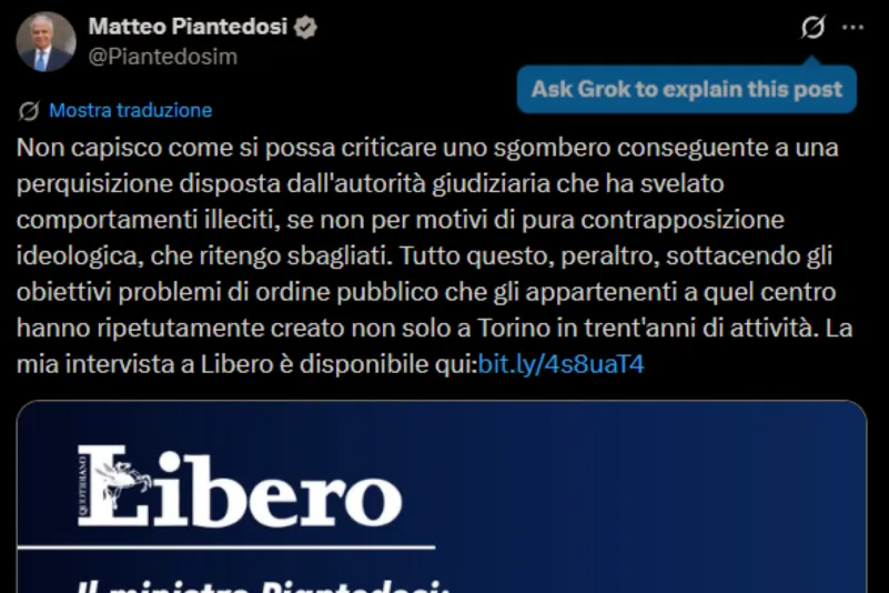 Il ministro dell’Interno Matteo Piantedosi ha scritto su X: «non capisco come si possa criticare uno sgombero conseguente a una perquisizione disposta dall’autorità giudiziaria che ha disvelato comportamenti illeciti, se non per motivi di pura contrapposizione ideologica, che ritengo sbagliati. Tutto questo, peraltro, sottacendo gli obiettivi problemi di ordine pubblico che gli appartenenti a quel centro hanno ripetutamente creato non solo a Torino in trent’anni di attività».