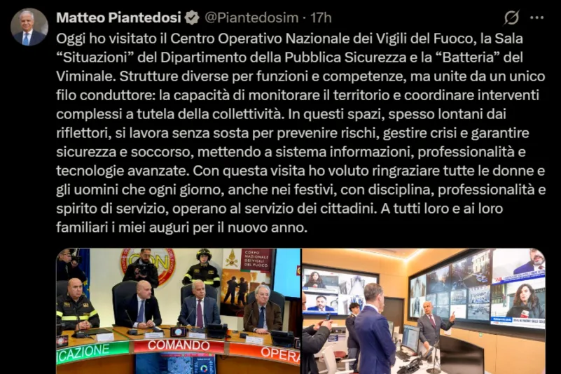 Il ministro dell’Interno Matteo Piantedosi ha scritto su X: «oggi ho visitato il centro operativo nazionale dei Vigili del Fuoco, la Sala “Situazioni” del dipartimento della pubblica sicurezza e la “Batteria” del Viminale. Strutture diverse per funzioni e competenze, ma unite da un unico filo conduttore, la capacità di monitorare il territorio e coordinare interventi complessi a tutela della collettività. In questi spazi, spesso lontani dai riflettori, si lavora senza sosta per prevenire rischi, gestire crisi e garantire sicurezza e soccorso, mettendo a sistema informazioni, professionalità e tecnologie avanzate. Con questa visita ho voluto ringraziare tutte le donne e gli uomini che ogni giorno, anche nei festivi, con disciplina, professionalità e spirito di servizio, operano al servizio dei cittadini. A tutti loro e ai loro familiari i miei auguri per il nuovo anno».