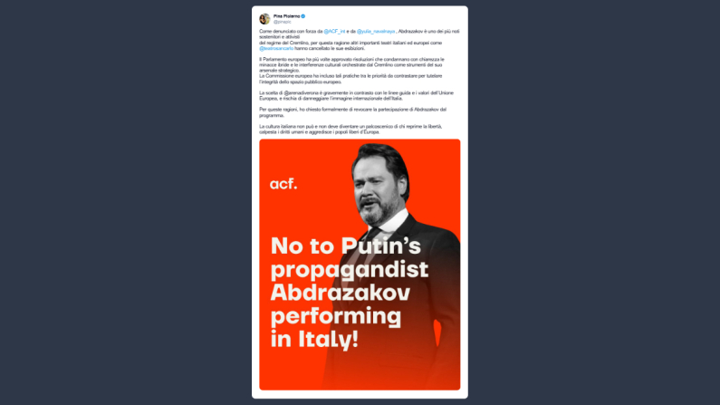 L’europarlamentare per il Partito Democratico, Pina Picierno, ha scritto ieri su X: «Come denunciato con forza da The Anti-Corruption Foundation e da Yulia Navalnaya, Abdrazakov è uno dei più noti sostenitori e attivisti del regime del Cremlino, per questa ragione altri importanti teatri italiani ed europei come il teatro San Carlo hanno cancellato le sue esibizioni. Il Parlamento europeo ha più volte approvato risoluzioni che condannano con chiarezza le minacce ibride e le interferenze culturali orchestrate dal Cremlino come strumenti del suo arsenale strategico.