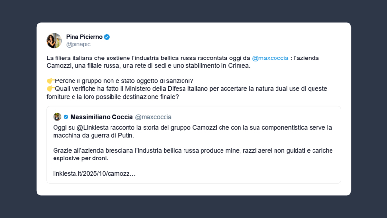 L’europarlamentare per il Partito Democratico, Pina Picierno, ha scritto su X: «la filiera italiana che sostiene l’industria bellica russa raccontata oggi da Massimiliano Coccia: l’azienda Camozzi, una filiale russa, una rete di sedi e uno stabilimento in Crimea».