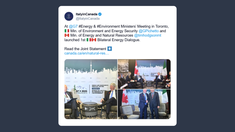 L’ambasciata italiana in Canada ha scritto ieri su X: «Nel corso del vertice dei ministri dell’Energia e dell’Ambiente del G7 a Toronto, il ministro italiano dell’Ambiente e della sicurezza energetica Gilberto Pichetto e il ministro canadese dell’Energia e delle risorse naturali Tim Hodgson hanno avviato il primo dialogo bilaterale Italia-Canada sull’energia».
