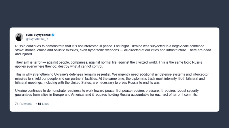 Il primo ministro ucraino, Yulia Svyrydenko, ha dichiarato in un post su X che la Russia starebbe «continuando a dimostrare di non essere interessata alla pace». Ieri notte, l’Ucraina è stata colpita simultaneamente da droni, missili da crociera, missili balistici e armi ipersoniche. L’obiettivo di Mosca, dice Svyrydenko, è il «terrore: contro le persone, le aziende, la vita e il mondo civile. È la stessa logica che la Russia applica ovunque vada: distruggere ciò che non può controllare».