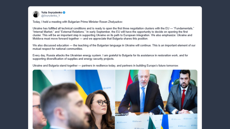 «Oggi ho tenuto un incontro con il primo ministro bulgaro Rosen Zhelyazkov. L’Ucraina ha soddisfatto tutte le condizioni tecniche ed è pronta ad aprire i primi tre capitoli negoziali con l’Unione Europea: “fondamentali, mercato interno e relazioni estere”». Lo ha dichiarato il primo ministro ucraino, Yulia Svyrydenko, in un post su X. Sarà un passo importante, dice Svyrydenk, per «sostenere l’Ucraina nel suo percorso verso l’integrazione europea». Ogni giorno, la Russia «attacca» il sistema energetico ucraino, e sono «grata alla Bulgaria per il sostegno alla diversificazione delle forniture e ai progetti per la sicurezza energetica».
