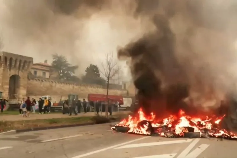 Proteste contro l’abbattimento di mucche in Francia, agricoltori erigono una barricata di fuoco