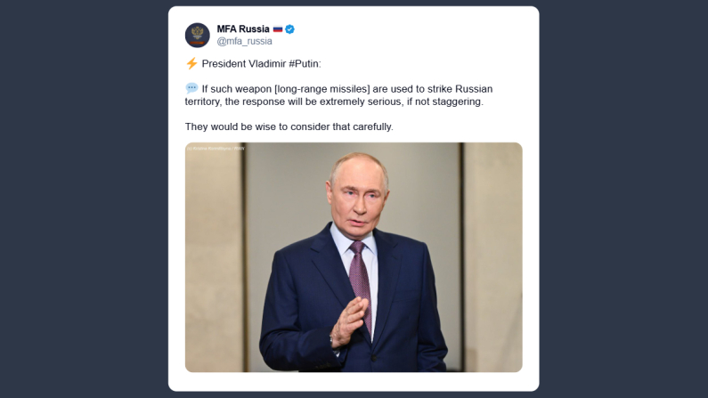 Il ministero degli Esteri russo ha scritto ieri su X la seguente dichiarazione del presidente Vladimir Putin: «Se armi come i missili a lungo raggio verranno usate per colpire il territorio russo, la risposta sarà estremamente severa, se non sconvolgente. Farebbero bene a rifletterci con attenzione».