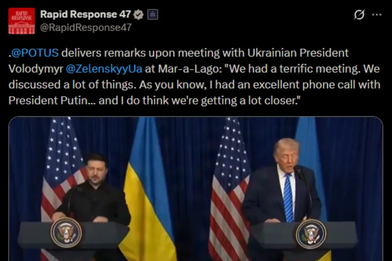 La Casa Bianca ha scritto su X via Rapid Response 47 la seguente dichiarazione del presidente Donald Trump durante l’incontro con il presidente ucraino Volodymyr Zelensky a Mar-a-Lago: «abbiamo avuto un incontro fantastico. Abbiamo discusso di molte cose. Come sapete, ho avuto un’eccellente telefonata con il presidente Putin. Penso che ci stiamo avvicinando molto».