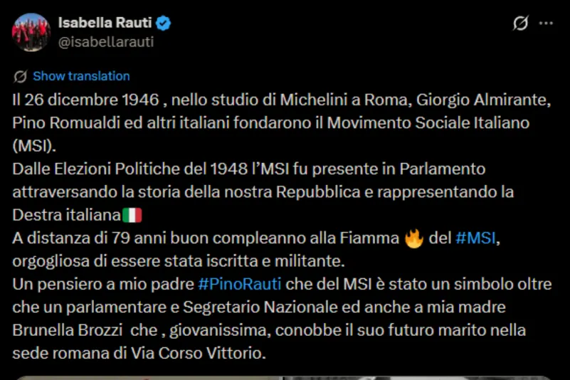 Il sottosegretario di Stato alla Difesa Isabella Rauti ha scritto su X: «il 26 dicembre 1946 , nello studio di Michelini a Roma, Giorgio Almirante, Pino Romualdi ed altri italiani fondarono il Movimento Sociale Italiano (MSI). Dalle elezioni politiche del 1948 l’MSI fu presente in Parlamento attraversando la storia della nostra Repubblica e rappresentando la destra italiana. A distanza di 79 anni buon compleanno alla Fiamma del MSI, orgogliosa di essere stata iscritta e militante. Un pensiero a mio padre Pino Rauti che del MSI è stato un simbolo oltre che un parlamentare e segretario nazionale ed anche a mia madre Brunella Brozzi che , giovanissima, aveva conosciuto il suo futuro marito nella sede romana di via Corso Vittorio».