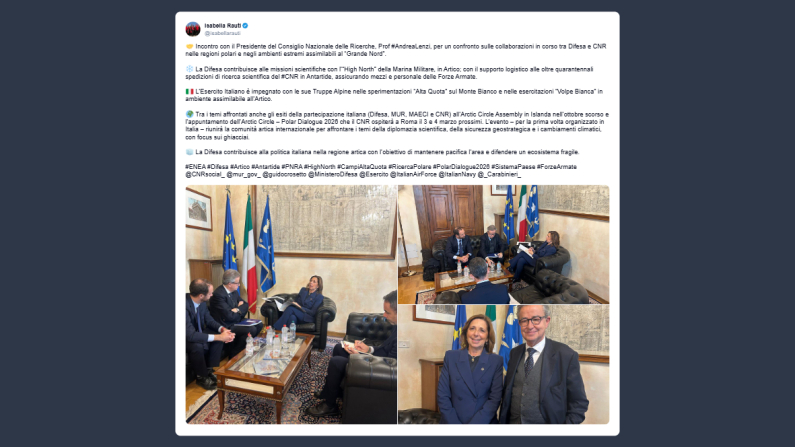 Il sottosegretario di Stato alla Difesa, Isabella Rauti, ha scritto ieri su X: «incontro con il presidente del consiglio nazionale delle Ricerche, Prof Andrea Lenzi, per un confronto sulle collaborazioni in corso tra Difesa e Cnr nelle regioni polari e negli ambienti estremi assimilabili al “grande nord”. La Difesa contribuisce alle missioni scientifiche con l’“High North” della Marina Militare, in Artico, con il supporto logistico alle oltre quarantennali spedizioni di ricerca scientifica del Cnr in Antartide, assicurando mezzi e personale delle Forze Armate. L’Esercito italiano è impegnato con le sue truppe alpine nelle sperimentazioni “alta quota” sul monte Bianco e nelle esercitazioni “volpe bianca” in ambiente assimilabile all’Artico. Tra i temi affrontati anche gli esiti della partecipazione italiana (Difesa, Mur, Maeci e Cnr) all’Arctic Circle Assembly in Islanda nell’ottobre scorso e l’appuntamento dell’Arctic Circle, Polar Dialogue 2026 che il Cnr ospiterà a Roma il 3 e 4 marzo prossimi. L’evento per la prima volta organizzato in Italia riunirà la comunità artica internazionale per affrontare i temi della diplomazia scientifica, della sicurezza geostrategica e i cambiamenti climatici, con focus sui ghiacciai. La Difesa contribuisce alla politica italiana nella regione artica con l’obiettivo di mantenere pacifica l’area e difendere un ecosistema fragile».