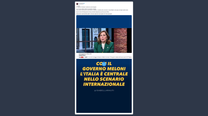 Il sottosegretario di Stato alla Difesa, Isabella Rauti, ha pubblicato un post su X con le sue dichiarazioni ad Agenda di Sky Tg24: «con il Governo Meloni l’Italia ha riacquistato centralità nello scenario internazionale, autorevolezza e credibilità. La stabilità politica nazionale ci rende affidabili anche agli occhi degli investitori esteri».