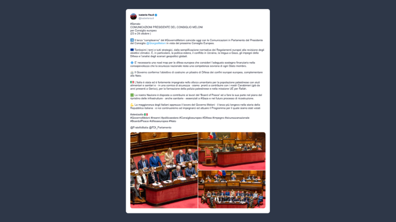 Il sottosegretario di Stato alla Difesa, Isabella Rauti, ha scritto su X: «Il terzo “compleanno” del Governo Meloni coincide oggi con le Comunicazioni in Parlamento del Presidente del Consiglio Giorgia Meloni in vista del prossimo Consiglio Europeo. Tantissimi i temi e tutti strategici, dalla semplificazione normativa dei Regolamenti europei alla revisione degli obiettivi climatici. E, in particolare, la politica estera, il conflitto in Ucraina, la tregua a Gaza, gli impegni della Difesa e l’analisi degli scenari geopolitici mondiali».