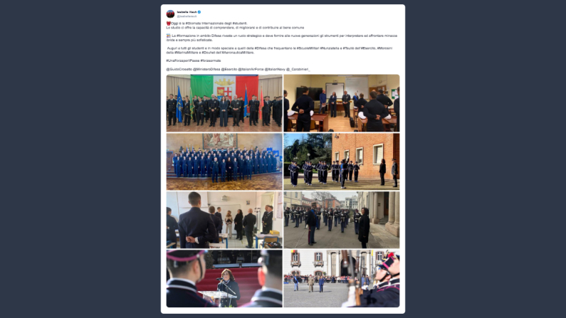 Il sottosegretario di Stato alla Difesa, Isabella Rauti, ha scritto su X: «oggi è la Giornata internazionale degli studenti. Lo studio ci offre la capacità di comprendere, di migliorarsi e di contribuire al bene comune. La formazione in ambito di Difesa riveste un ruolo strategico e deve fornire alle nuove generazioni gli strumenti per interpretare ed affrontare minacce ibride e sempre più sofisticate. Auguri a tutti gli studenti e in modo speciale a quelli della Difesa che frequentano le scuole militari Nunziatella e Teulié dell’Esercito, Morosini della Marina Militare e Douhet dell’Aeronautica Militare».