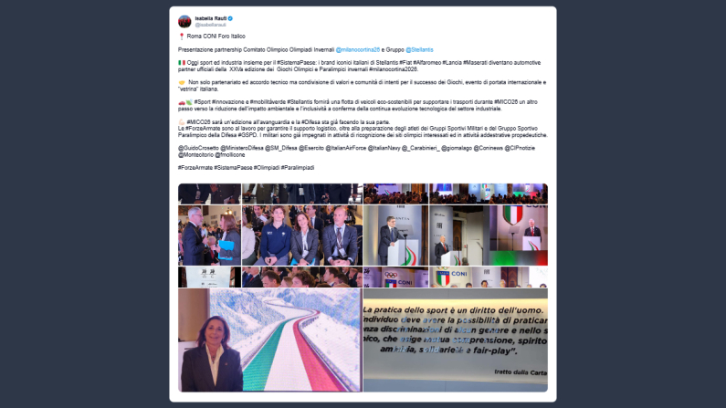 Il sottosegretario di Stato alla Difesa, Isabella Rauti, ha scritto su X: «presentazione partnership comitato Olimpico Olimpiadi invernali. Milano, Cortina 26 e gruppo Stellantis. Oggi sport ed industria insieme per il sistema Paese: i brand iconici italiani di Stellantis Fiat, Alfa Romeo, Lancia, Maserati, diventano automotive partner ufficiali della 25° edizione dei giochi Olimpici e paralimpici invernali. Non solo partenariato ed accordo tecnico ma condivisione di valori e comunità di intenti per il successo dei giochi, evento di portata internazionale e “vetrina” italiana. Sport, innovazione e mobilità verde, Stellantis fornirà una flotta di veicoli eco-sostenibili per supportare i trasporti durante Mico26 un altro passo verso la riduzione dell’impatto ambientale e l’inclusività a conferma della continua evoluzione tecnologica del settore industriale. Mico26 sarà un’edizione all’avanguardia e la Difesa sta già facendo la sua parte. Le Forze Armate sono al lavoro per garantire il supporto logistico, oltre alla preparazione degli atleti dei gruppi sportivi Militari e del gruppo sportivo paralimpico della Difesa Gspd. I militari sono già impegnati in attività di ricognizione dei siti olimpici interessati ed in attività addestrative propedeutiche».