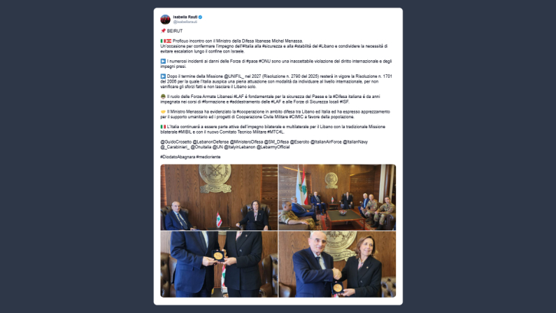 Il sottosegretario di Stato alla Difesa, Isabella Rauti, ha scritto ieri su X: «proficuo incontro con il ministro della Difesa libanese Michel Menassa. Un’occasione per confermare l’impegno dell’Italia alla sicurezza e alla stabilità del Libano e condividere la necessità di evitare escalation lungo il confine con Israele. I numerosi incidenti ai danni delle Forze di pace Onu sono una inaccettabile violazione del diritto internazionale e degli impegni presi. Dopo il termine della missione della Forza di interposizione delle Nazioni Unite in Libano Unifil nel 2027 (Risoluzione n. 2790 del 2025) resterà in vigore la Risoluzione n. 1701 del 2006 per la quale l’Italia auspica una piena attuazione con modalità da individuare al livello internazionale, per non vanificare gli sforzi fatti e non lasciare il Libano solo. Il ruolo delle Forze armate libanesi Laf è fondamentale per la sicurezza del Paese e la Difesa italiana è da anni impegnata nei corsi di formazione e addestramento delle Laf e alle Forze di sicurezza locali Isf. Il ministro Menassa ha evidenziato la cooperazione in ambito difesa tra Libano ed Italia ed ha espresso apprezzamento per il supporto umanitario ed i progetti di cooperazione civile militare Cimic a favore della popolazione. L’Italia continuerà a essere parte attiva dell’impegno bilaterale e multilaterale per il Libano con la tradizionale Missione bilaterale Mibil e con il nuovo comitato tecnico militare Mtc4l».