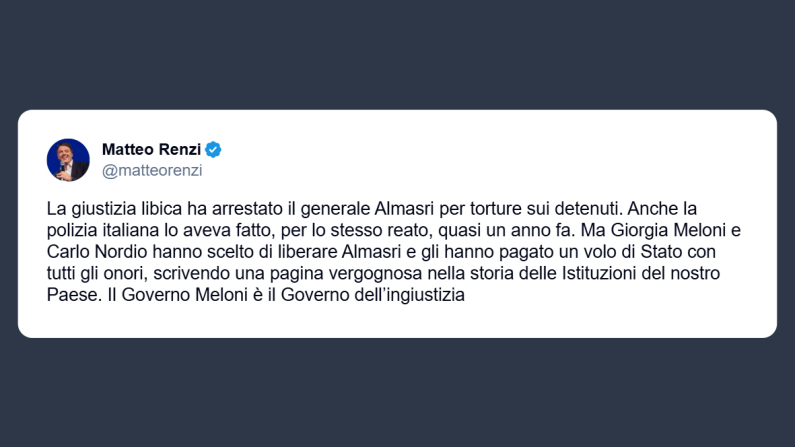 Il segretario di Italia Viva, Matteo Renzi, ha scritto oggi su X: «la giustizia libica ha arrestato il generale Almasri per torture sui detenuti. Anche la polizia italiana lo aveva fatto, per lo stesso reato, quasi un anno fa. Ma Giorgia Meloni e Carlo Nordio hanno scelto di liberare Almasri e gli hanno pagato un volo di Stato con tutti gli onori, scrivendo una pagina vergognosa nella storia delle Istituzioni del nostro Paese. Il Governo Meloni è il Governo dell’ingiustizia».