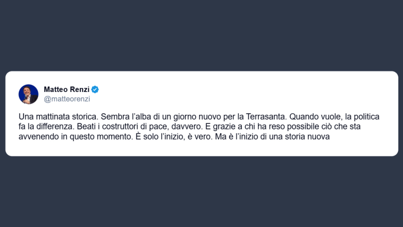 «Una mattinata storica. Sembra l’alba di un giorno nuovo per la Terrasanta. Quando vuole, la politica fa la differenza». Lo ha dichiarato su X il segretario di Italia Viva, Matteo Renzi, in riferimento agli ostaggi rilasciati a Gaza, in accordo con il piano di Trump. Un «grazie» va a chi ha reso possibile ciò che sta avvenendo in questo momento, dice Renzi, anche se «è solo l’inizio, è vero. Ma è l’inizio di una storia nuova».