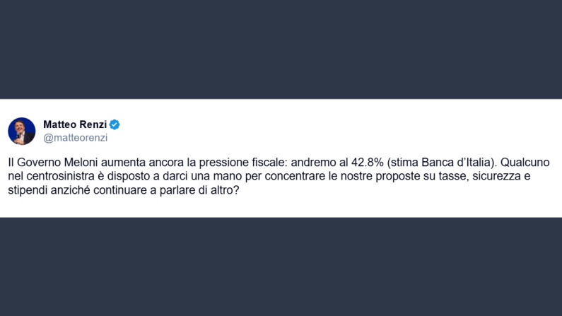 Il segretario di Italia Viva, Matteo Renzi, ha dichiarato su X: «il Governo Meloni aumenta ancora la pressione fiscale: andremo al 42.8% (stima Banca d’Italia). Qualcuno nel centrosinistra è disposto a darci una mano per concentrare le nostre proposte su tasse, sicurezza e stipendi anziché continuare a parlare di altro?»
