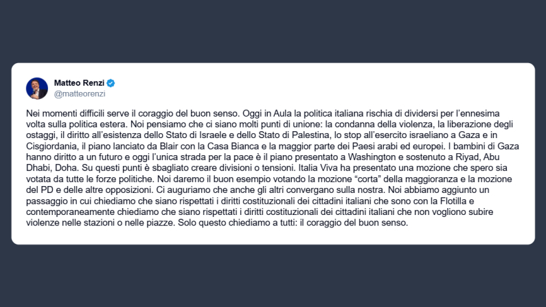 Il segretario di Italia Viva, Matteo Renzi, ha comunicato su X che «oggi in Aula la politica italiana rischia di dividersi per l’ennesima volta sulla politica estera. Noi pensiamo che ci siano molti punti di unione: la condanna della violenza, la liberazione degli ostaggi, il diritto all’esistenza dello Stato di Israele e dello Stato di Palestina, lo stop all’esercito israeliano a Gaza e in Cisgiordania, il piano lanciato da Blair con la Casa Bianca e la maggior parte dei Paesi arabi ed europei». I bambini di Gaza – prosegue Renzi – hanno «diritto a un futuro e oggi l’unica strada per la pace è il piano presentato a Washington e sostenuto a Riyad, Abu Dhabi, Doha. Su questi punti è sbagliato creare divisioni o tensioni […] noi daremo il buon esempio votando la mozione “corta” della maggioranza e la mozione del PD e delle altre opposizioni».
