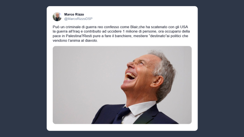 Il presidente di Democrazia Sovrana Popolare, Marco Rizzo, ha scritto su X: «Può un criminale di guerra reo confesso come Blair, che ha scatenato con gli Usa la guerra all’Iraq e contribuito ad uccidere 1 milione di persone, ora occuparsi della pace in Palestina? Resti pure a fare il banchiere, mestiere “destinato” ai politici che vendono l’anima al diavolo».