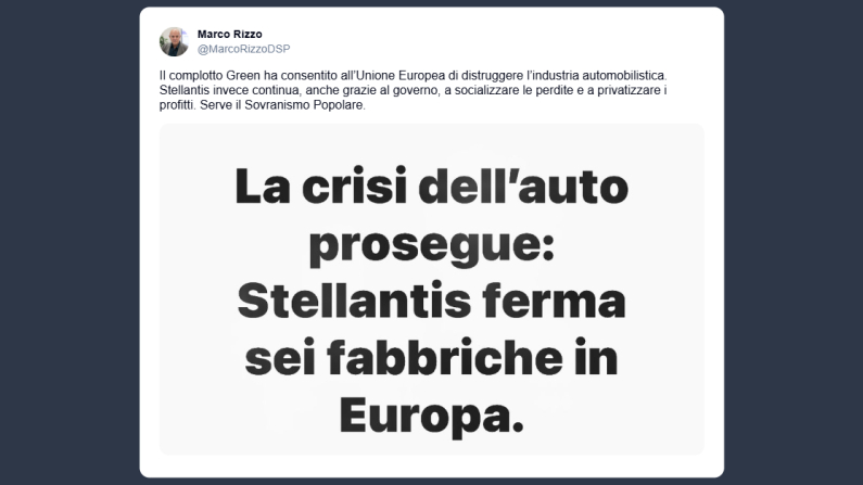 Il presidente di Democrazia Sovrana Popolare, Marco Rizzo, ha dichiarato su che il «complotto Green» ha consentito all’Unione Europea di «distruggere l’industria automobilistica». Stellantis invece – prosegue Rizzo – «continua, anche grazie al Governo, a socializzare le perdite e a privatizzare i profitti. Serve il Sovranismo Popolare».