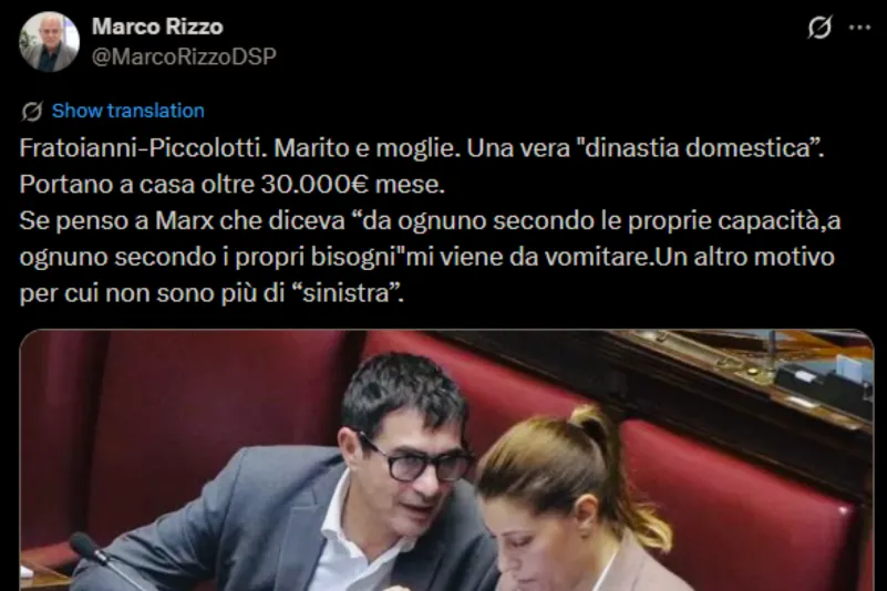 Il presidente di Democrazia Sovrana Popolare Marco Rizzo ha scritto su X: «Fratoianni Piccolotti. Marito e moglie. Una vera “dinastia domestica”. Portano a casa oltre 30.000€ mese. Se penso a Marx che diceva da ognuno secondo le proprie capacità, a ognuno secondo i propri bisogni mi viene da vomitare. Un altro motivo per cui non sono più di sinistra».