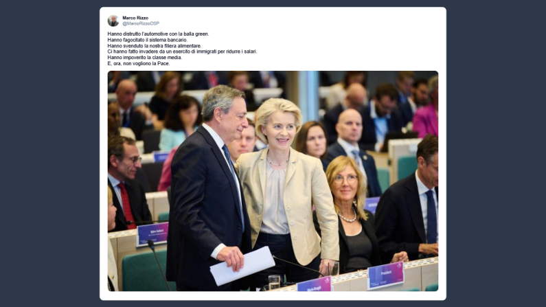 Il presidente di Democrazia Sovrana Popolare, Marco Rizzo, ha scritto su X: «hanno distrutto l’automotive con la balla green. Hanno fagocitato il sistema bancario. Hanno svenduto la nostra filiera alimentare. Ci hanno fatto invadere da un esercito di immigrati per ridurre i salari. Hanno impoverito la classe media. E, ora, non vogliono la pace».