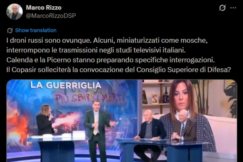 Il presidente di Democrazia Sovrana Popolare Marco Rizzo ha scritto su X: «i droni russi sono ovunque. Alcuni, miniaturizzati come mosche, interrompono le trasmissioni negli studi televisivi italiani. Calenda e la Picerno stanno preparando specifiche interrogazioni. Il Copasir solleciterà la convocazione del Consiglio superiore di Difesa?»