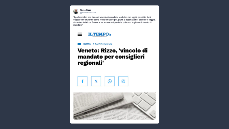 Il presidente di Democrazia Sovrana Popolare, Marco Rizzo, ha scritto ieri su X: «I parlamentari non hanno il vincolo di mandato, vuol dire che oggi è possibile farsi eleggere in un partito come fosse un taxi e poi, giunti a destinazione, ottenuto il seggio, si cambia indirizzo. Da noi si va a casa e si perde la poltrona. Vogliamo il vincolo di mandato».