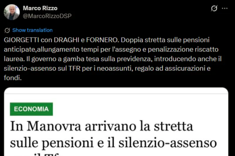 Il presidente di Democrazia Sovrana Popolare Marco Rizzo ha scritto su X: «Giorgetti con Draghi e Fornero. Doppia stretta sulle pensioni anticipate, allungamento tempi per l’assegno e penalizzazione riscatto laurea. Il Governo a gamba tesa sulla previdenza, introducendo anche il silenzio assenso sul Tfr per i neoassunti, regalo ad assicurazioni e fondi».