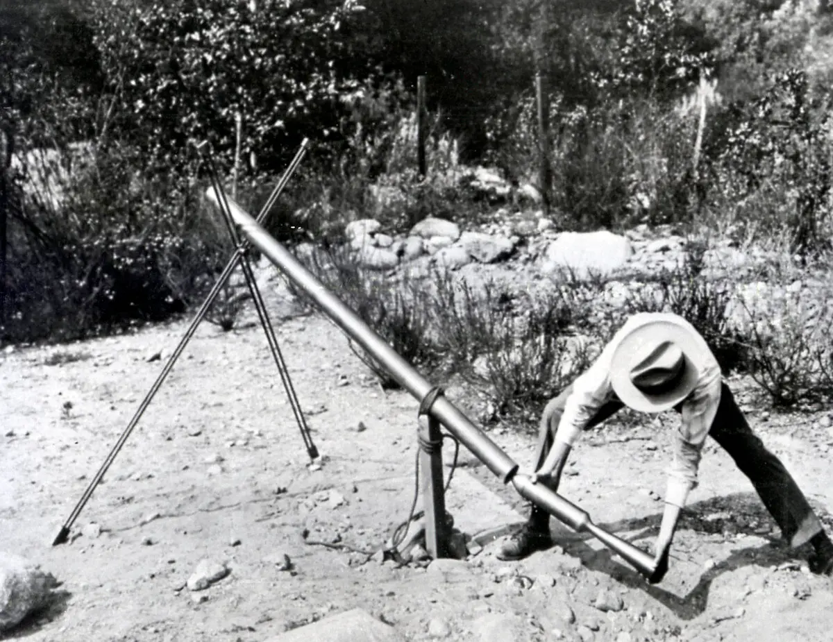 Goddard traina un razzo a Roswell, New Mexico. Pubblico dominio.