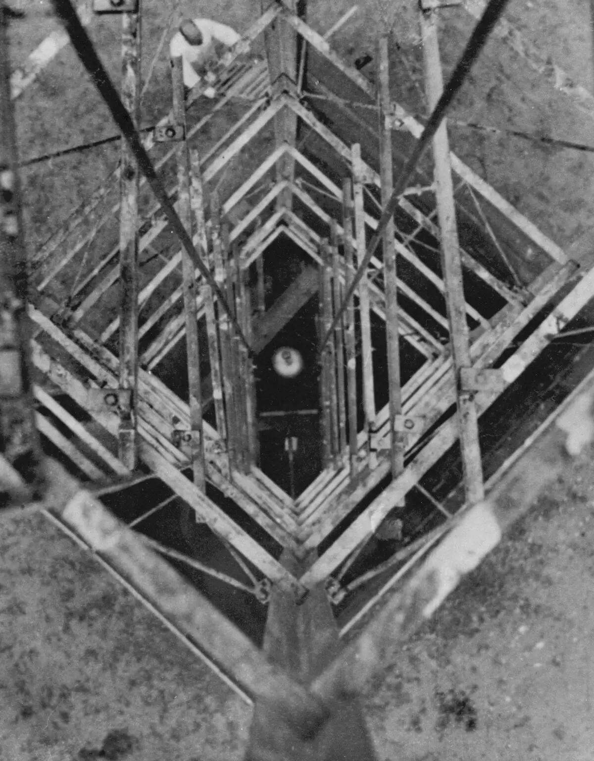 Robert H. Goddard mentre guarda giù dalla torre di lancio. Foto di Charles Lindbergh, 23 settembre 1935 a Roswell, nel New Mexico. Pubblico dominio.