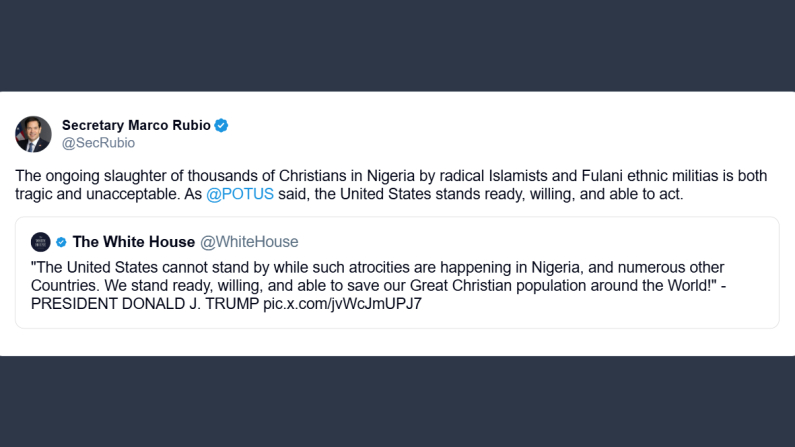 Il ministro degli Esteri americano, Marco Rubio, ha scritto ieri su X: «la strage in corso di migliaia di cristiani in Nigeria da parte di islamici estremisti e milizie etniche Fulani è tragica e inaccettabile. Come ha detto il presidente degli Stati Uniti Donald Trump, gli Usa sono pronti, determinati e capaci di intervenire».