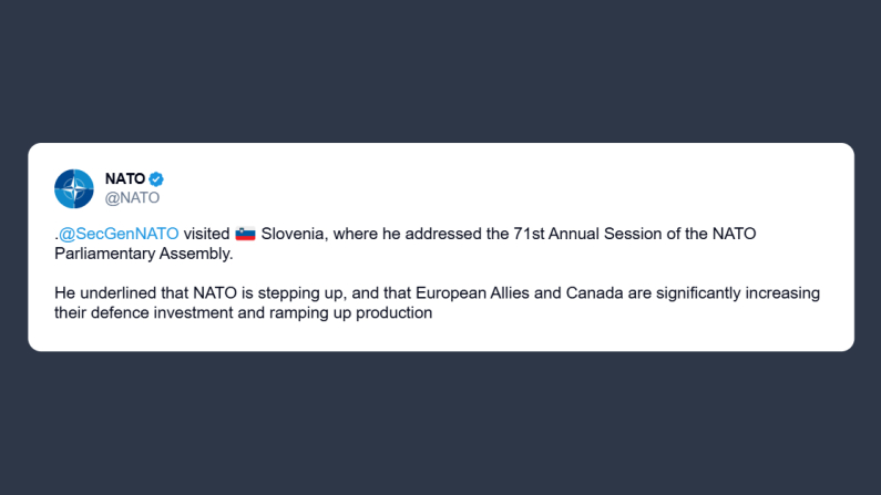 La Nato ha annunciato su X la visita in Slovenia del segretario generale della Nato, Mark Rutte, dove ha tenuto un discorso alla 71ª Sessione Annuale dell’Assemblea Parlamentare della Nato. Rutte ha sottolineato che la Nato sta intensificando i suoi sforzi e che gli alleati europei e il Canada stanno aumentando significativamente gli investimenti nella difesa e incrementando la produzione.