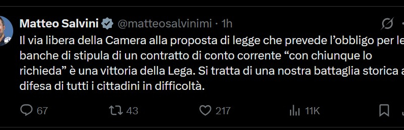 Il vicepremier e leader della Lega, Matteo Salvini, ha scritto in un post su X: «Il via libera della Camera alla proposta di legge che prevede l’obbligo per le banche di stipula di un contratto di conto corrente “con chiunque lo richieda” è una vittoria della Lega». Salvini ha definito la misura «una nostra battaglia storica a difesa di tutti i cittadini in difficoltà».