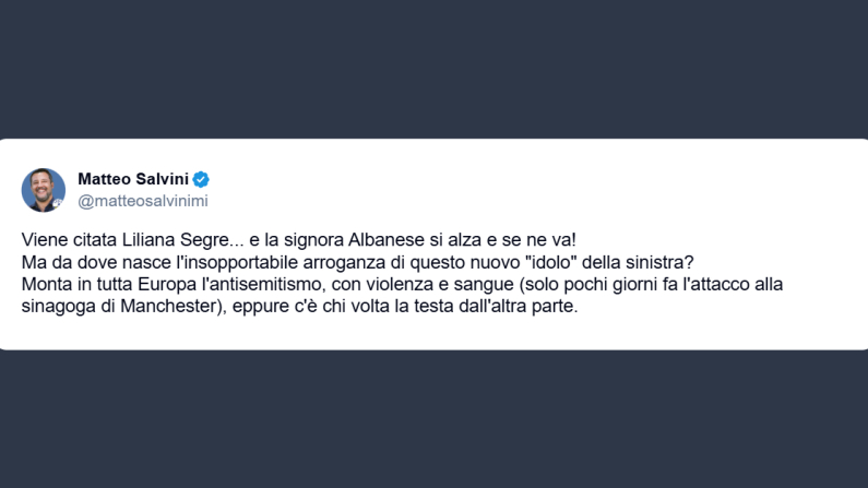«Viene citata Liliana Segre e la signora Albanese si alza e se ne va. Ma da dove nasce l’insopportabile arroganza di questo nuovo “idolo” della sinistra?». Lo ha dichiarato il segretario della Lega, Matteo Salvini, su X, in riferimento all’abbandono della relatrice speciale per le Nazioni Unite, Francesca Albanese, alla trasmissione “in Onda” di La7, quando l’editore di Historica Edizioni, Francesco Giubilei ha menzionato la senatrice a vita Liliana Segre. «Monta in tutta Europa l’antisemitismo, con violenza e sangue (solo pochi giorni fa l’attacco alla sinagoga di Manchester), eppure c’è chi volta la testa dall’altra parte», ha concluso Salvini.