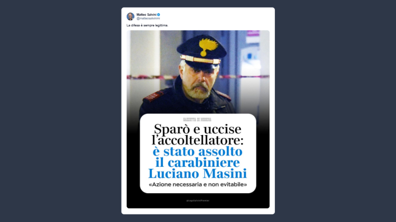 Il segretario della Lega, Matteo Salvini, commentando l’assoluzione del carabiniere che per difendersi aveva sparato a un accoltellatore uccidendolo ha scritto ieri su X: «La difesa è sempre legittima».