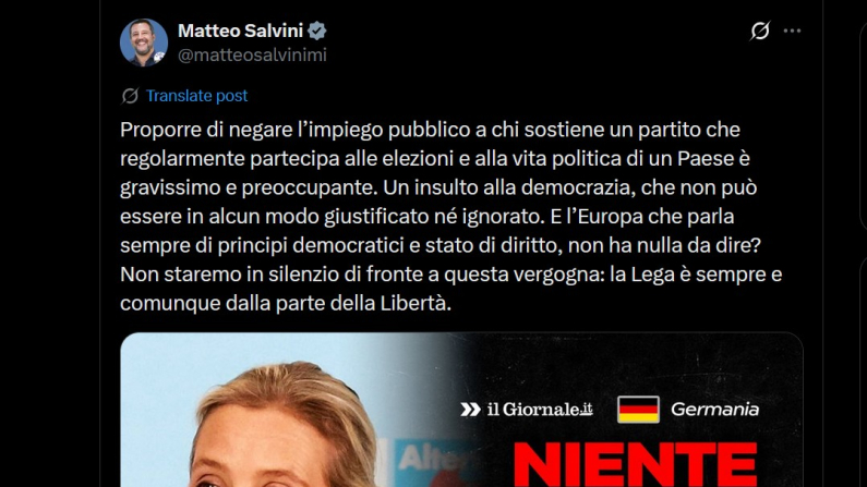 Il vicepremier e ministro delle Infrastrutture e dei Trasporti, Matteo Salvini, ha dichiarato su X che «Proporre di negare l’impiego pubblico a chi sostiene un partito che regolarmente partecipa alle elezioni e alla vita politica di un Paese è gravissimo e preoccupante», ha dichiarato. «Un insulto alla democrazia, che non può essere in alcun modo giustificato né ignorato. E l’Europa che parla sempre di principi democratici e stato di diritto, non ha nulla da dire?». Salvini ha poi aggiunto: «Non staremo in silenzio di fronte a questa vergogna: la Lega è sempre e comunque dalla parte della Libertà».