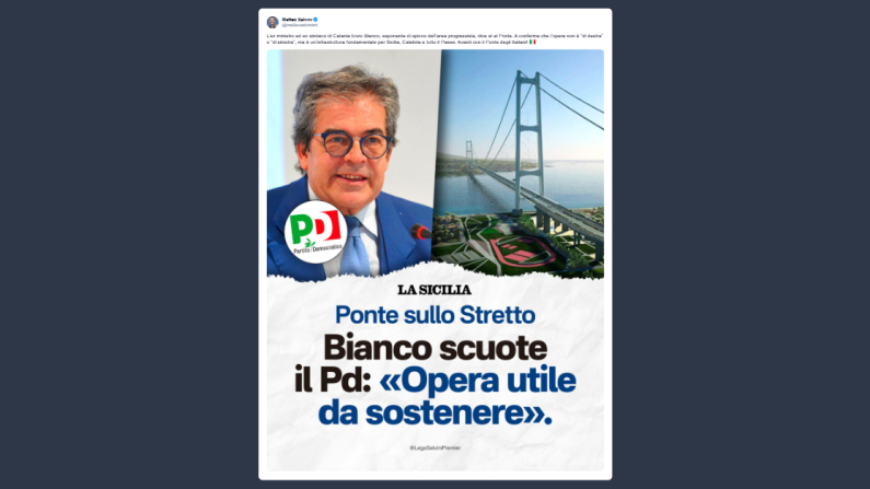 Il ministro dei Trasporti, Matteo Salvini, ha commentato su X la visione favorevole al Ponte sullo Stretto di Messina dell’ex sindaco di Catania, Enzo Bianco. «L’ex ministro Enzo Bianco, esponente di spicco dell’area progressista, dice sì al Ponte». Questa sarebbe per Salvini la «conferma che l’opera non è “di destra” o “di sinistra”, ma è un’infrastruttura fondamentale per Sicilia, Calabria e tutto il Paese».