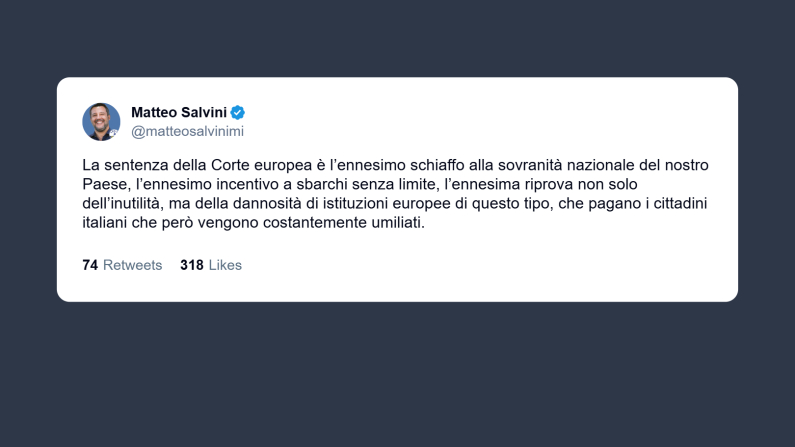 Salvini: sentenza Ue schiaffo alla sovranità e incentivo sbarchi