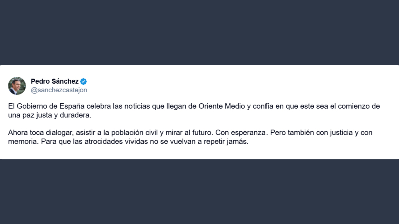 Il primo ministro spagnolo, Pedro Sanchez, ha scritto su X: «Il Governo di Spagna accoglie con favore le notizie provenienti dal Medio Oriente e confida che questo sia l’inizio di una pace giusta e duratura. Ora è il momento di dialogare, fornire assistenza alla popolazione civile e guardare al futuro. Con speranza. Ma anche con giustizia e memoria, affinché le atrocità vissute non si ripetano mai più».