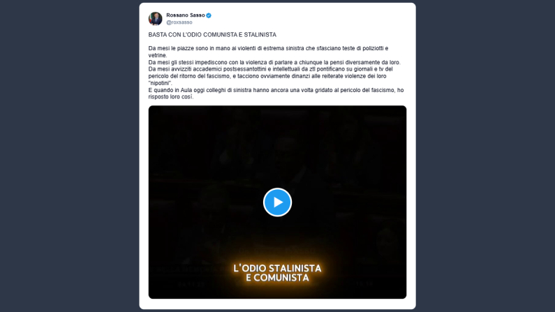 Nel video condiviso su X, Sasso ha dichiarato che «l’odio stalinista e comunista di chi va in piazza e bardato con simboli che non ci appartengono, canta, per esempio, dal fiume al mare, che per chi non lo sapesse, vuol dire la distruzione etnica dello Stato di Israele. L’odio stalinista e comunista di chi impedisce con la violenza la libertà di espressione a chiunque la pensi diversamente da loro. L’odio stalinista e comunista dei tanti cattivi maestri che negano le foibe, che plaudono al maresciallo Tito, che inneggiano al 7 ottobre. L’odio stalinista e comunista dei tanti cattivi maestri che ricordano i bei tempi, che ricordano quando erano giovani e belli, ricordano quando i collettivi negavano la possibilità a persone che la pensavano diversamente da loro di potersi esprimere».