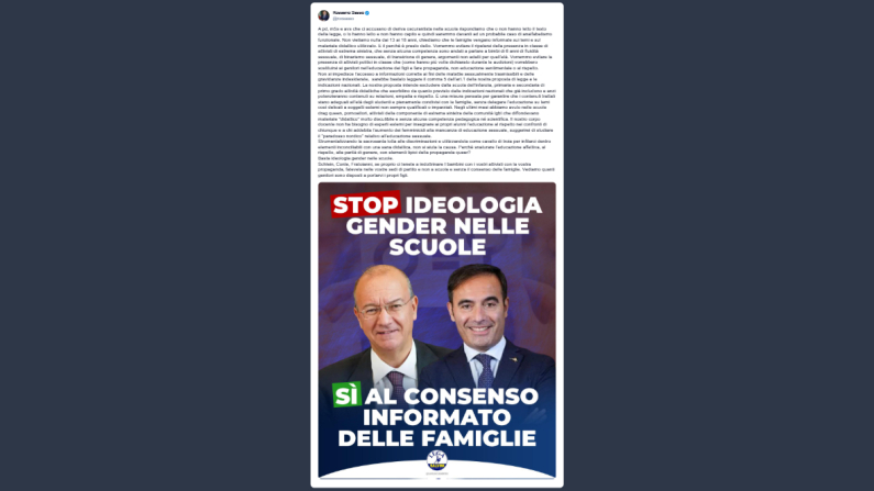 Per Sasso non si impedirebbe «l’accesso a informazioni corrette ai fini delle malattie sessualmente trasmissibili e delle gravidanze indesiderate, sarebbe bastato leggere il comma 5 dell’art.1 della nostra proposta di legge e le indicazioni nazionali». La proposta invece escluderebbe dalla scuola dell’infanzia, primaria e secondaria di primo grado attività didattiche che «esorbitino da quanto previsto dalle indicazioni nazionali che già includono e anzi potenzieranno contenuti su relazioni, empatia e rispetto. È una misura pensata per garantire che i contenuti trattati siano adeguati all’età degli studenti e pienamente condivisi con le famiglie, senza delegare l’educazione su temi così delicati a soggetti esterni non sempre qualificati o imparziali». Negli ultimi mesi, conclude Sasso, nelle scuole sono stati presenti «drag queen, pornoattori, attivisti della componente di estrema sinistra della comunità lgbt che diffondevano materiale “didattico” molto discutibile e senza alcuna competenza pedagogica né scientifica […] strumentalizzando la sacrosanta lotta alle discriminazioni e utilizzandola come cavallo di troia per infilarci dentro elementi inconciliabili con una sana didattica, non si aiuta la causa. Perchè snaturare l’educazione affettiva, al rispetto, alla parità di genere, con elementi tipici della propaganda queer?».