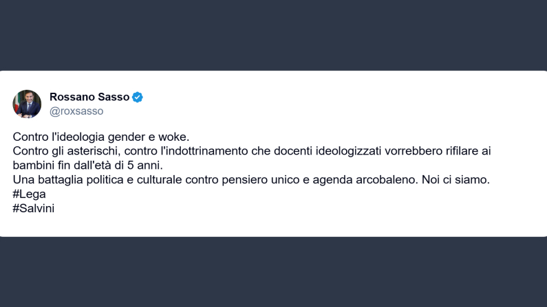 Il deputato della Lega, Rossano Sasso, ha scritto su X: «Contro l’ideologia gender e woke. Contro gli asterischi, contro l’indottrinamento che docenti ideologizzati vorrebbero rifilare ai bambini fin dall’età di 5 anni. Una battaglia politica e culturale contro pensiero unico e agenda arcobaleno. Noi ci siamo».