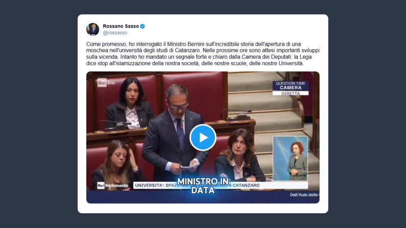 Il deputato della Lega, Rossano Sasso, ha scritto ieri su X: «Come promesso, ho interrogato il Ministro Bernini sull’incredibile storia dell’apertura di una moschea nell’università degli studi di Catanzaro. Nelle prossime ore sono attesi importanti sviluppi sulla vicenda. Intanto ho mandato un segnale forte e chiaro dalla Camera dei Deputati: la Lega dice stop all’islamizzazione della nostra società, delle nostre scuole, delle nostre Università».