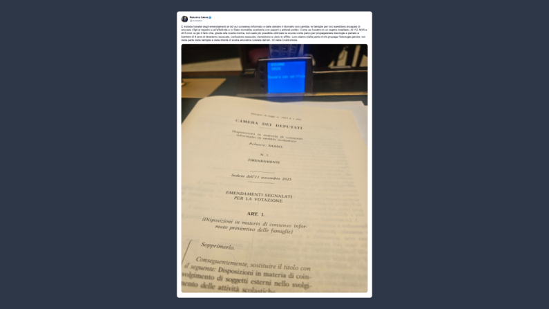 Il deputato della Lega, Rossano Sasso, ha scritto ieri su X: «è iniziata l’analisi degli emendamenti al ddl sul consenso informato e dalle sinistre il ritornello non cambia: le famiglie per loro sarebbero incapaci di educare i figli al rispetto e all’affettività e lo Stato dovrebbe sostituirle con esperti e attivisti politici. Come se fossimo in un regime totalitario. Al PD, M5S e AVS non va giù il fatto che, grazie alla nostra norma, non sarà più possibile utilizzare le scuole come palco per propagandare ideologie e parlare a bambini di 6 anni di binarismo sessuale, confusione sessuale, transizione e utero in affitto. Loro stanno dalla parte di chi propaga l’ideologia gender, noi dalla parte delle famiglie e della libertà di scelta educativa tutelata dall’art. 30 della Costituzione».