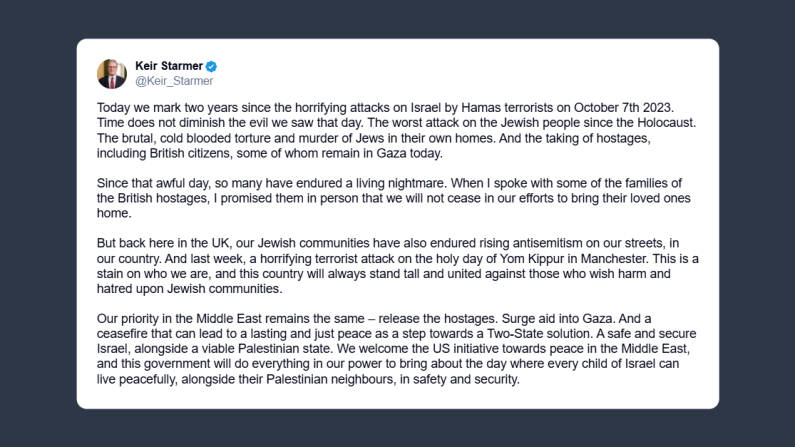 «Oggi ricorre il secondo anniversario degli orribili attacchi terroristici di Hamas contro Israele, avvenuti il 7 ottobre 2023. Il tempo non attenua il male che abbiamo visto quel giorno: il peggiore attacco contro il popolo ebraico dai tempi dell’Olocausto, con torture e assassinii a sangue freddo di ebrei nelle loro case e il rapimento di ostaggi, tra cui cittadini britannici, alcuni dei quali sono ancora trattenuti a Gaza».