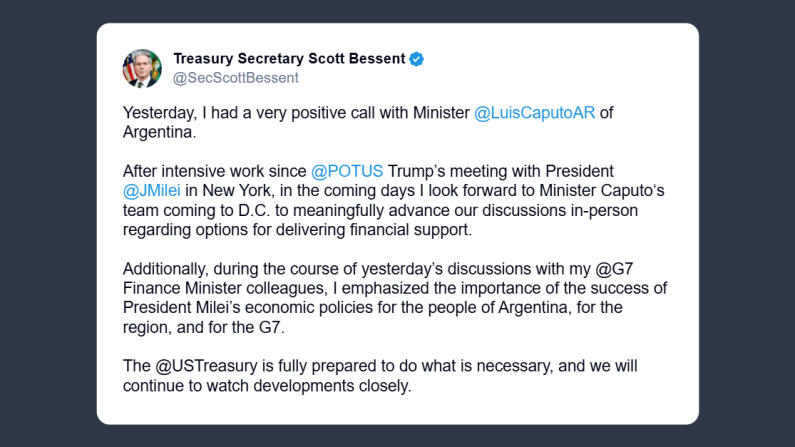 Il ministro degli Esteri americano Scott Bessent, ha commentato su X la stretta cooperazione Usa-Argentina per supportare il presidente argentino Javier Milei nelle trasformazione economia della sua nazione: «nei prossimi giorni attendo con interesse l’arrivo a Washington della squadra del ministro Caputo per portare avanti in modo concreto le nostre discussioni di persona sulle opzioni per fornire supporto finanziario. Inoltre, nel corso delle discussioni di ieri con i miei colleghi ministri delle Finanze del G7, ho sottolineato l’importanza del successo delle politiche economiche del presidente Milei per il popolo argentino, per la regione e per il G7. Il ministero del Tesoro degli Stati Uniti è pienamente pronto a fare quanto necessario e continueremo a monitorare da vicino gli sviluppi».