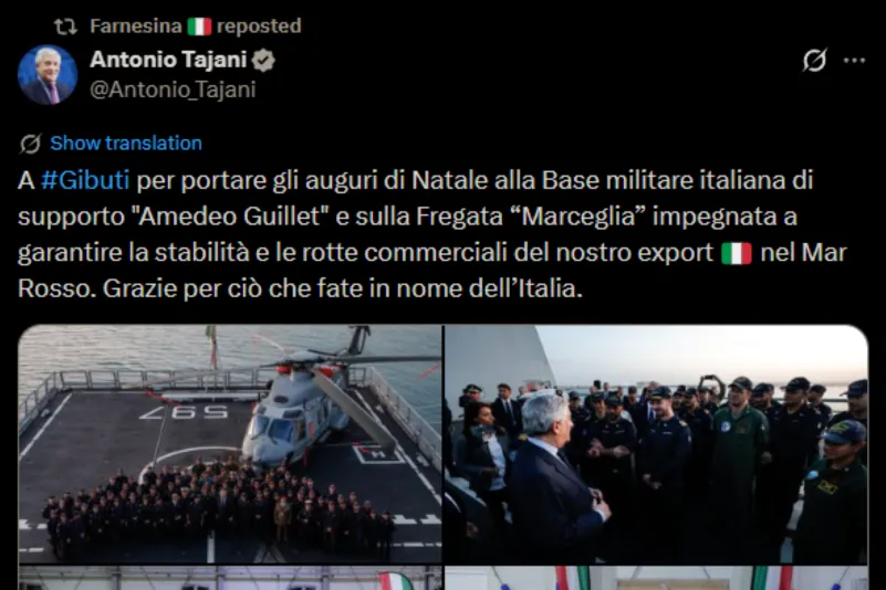 Il vicepremier e ministro degli Affari Esteri e della Cooperazione Internazionale Antonio Tajani ha scritto su X: «a Gibuti per portare gli auguri di Natale alla Base militare italiana di supporto Amedeo Guillet e sulla Fregata Marceglia impegnata a garantire la stabilità e le rotte commerciali del nostro export nel Mar Rosso. Grazie per ciò che fate in nome dell’Italia».